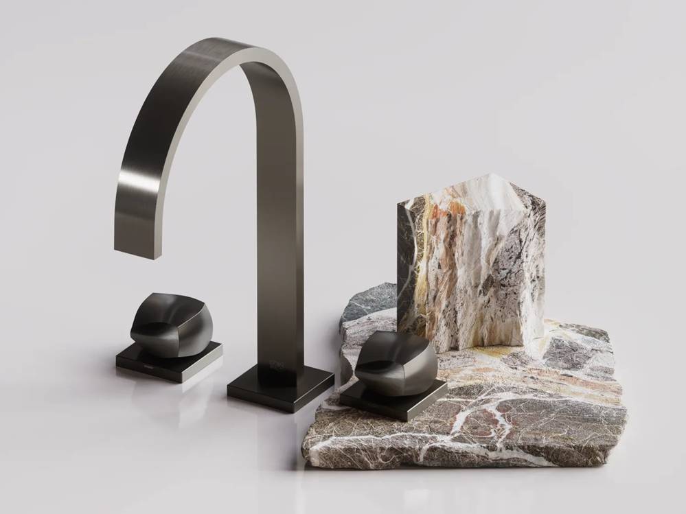 Sistema de grifería para baño basado en la serie MEM, reinterpretado mediante manillas con geometrías irregulares que simulan piedra tallada.