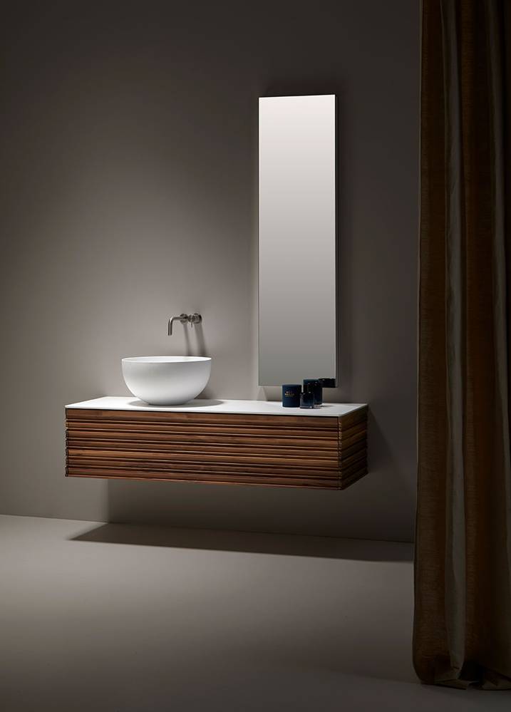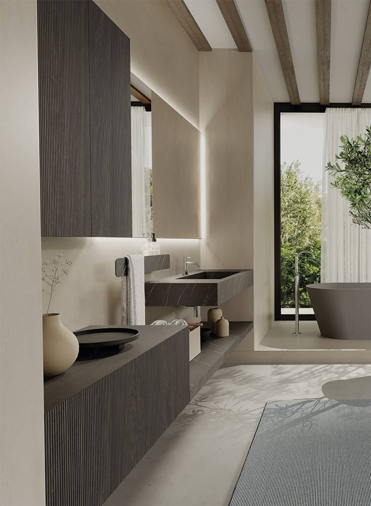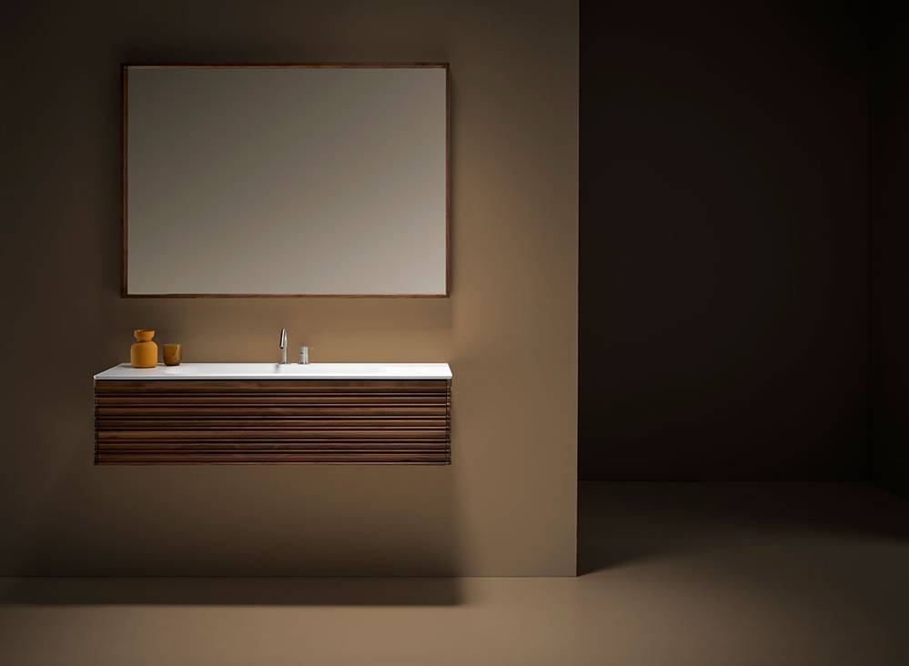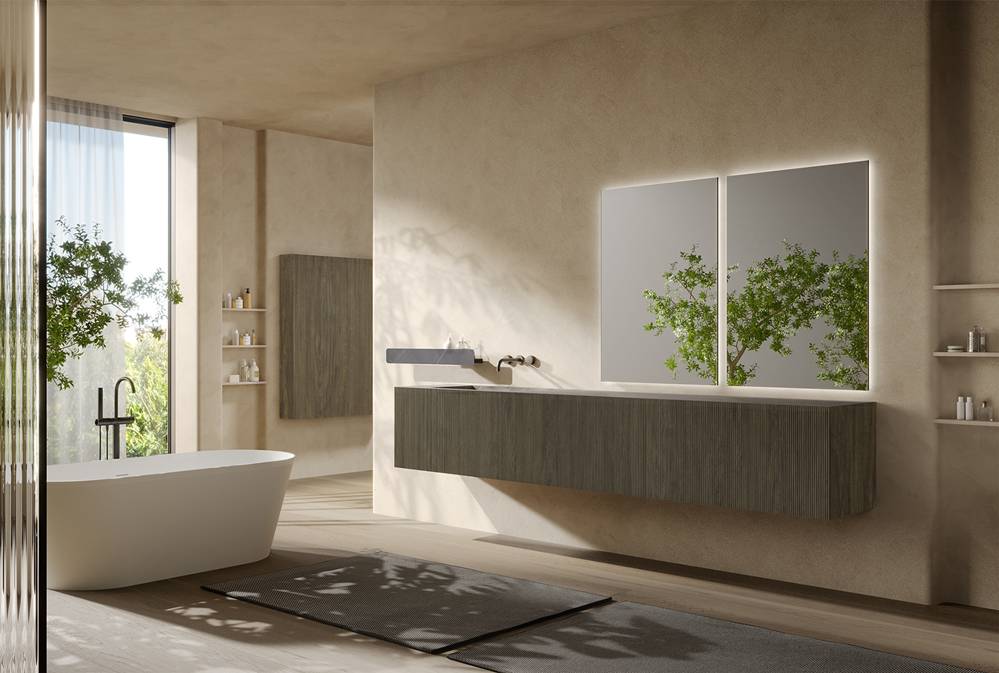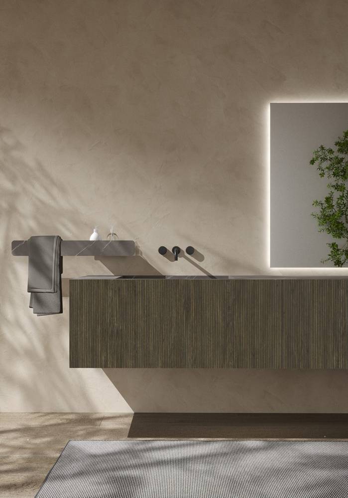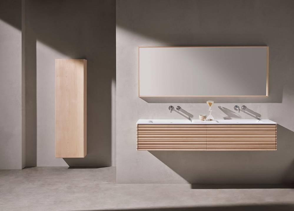 Colección en madera con frente alistonado horizontal, ideal para aportar profundidad visual y calidez al baño. Disponible en múltiples acabados y a medida, se integra fácilmente en proyectos de estilo escandinavo o contemporáneo. La iluminación integrada en su módulo cerrado refuerza su carácter funcional y elegante. Una opción versátil para baños que buscan diseño atemporal y orden visual, sin renunciar a la personalidad de los materiales nobles.