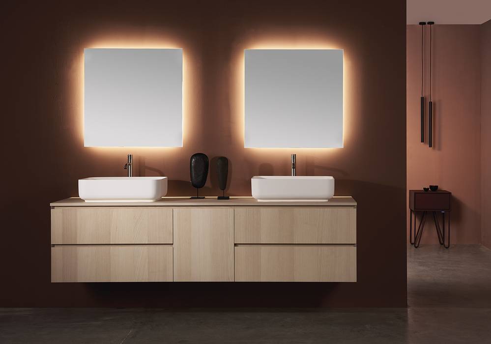Incluye bancos EDGE independientes, espejos ovalados con iluminación LED y grifería CODE, permitiendo composiciones elegantes y coherentes.