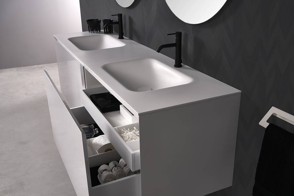 Muebles de baño suspendidos o con patas, en diferentes formatos y tamaños, llenos de detalles que potencian la funcionalidad.