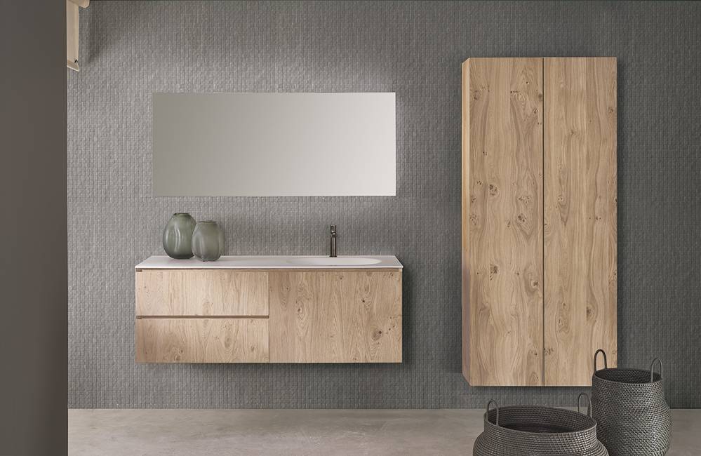 Con medidas desde 80 cm hasta composiciones de 240 cm, facilita soluciones versátiles con aspecto natural para proyectos de baño que prioricen almacenamiento.