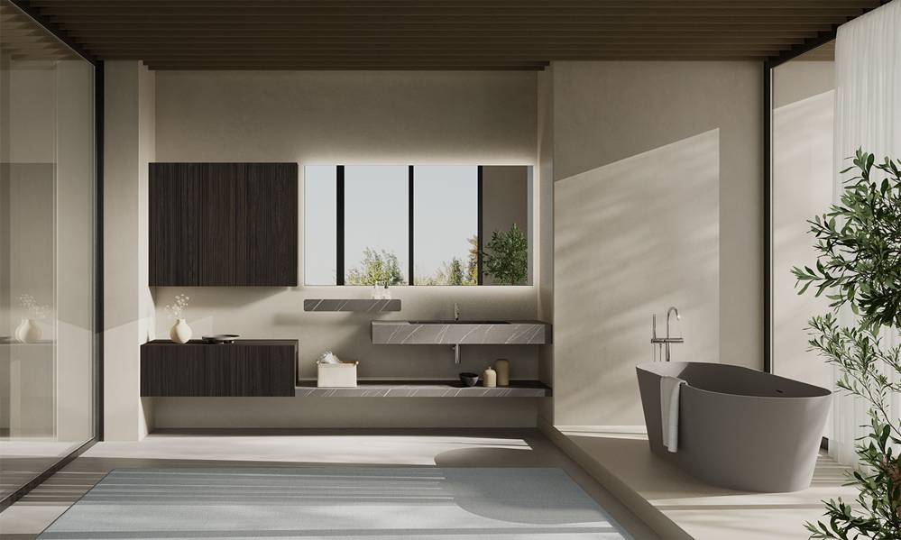 Su estética sofisticada, sobria y neutra, permite un diseño a medida capaz de adaptarse a cualquier espacio, creando un baño único y funcional. La modularidad de la colección garantiza una configuración totalmente personalizada, reforzada por la variedad en sus acabados y tonalidades.