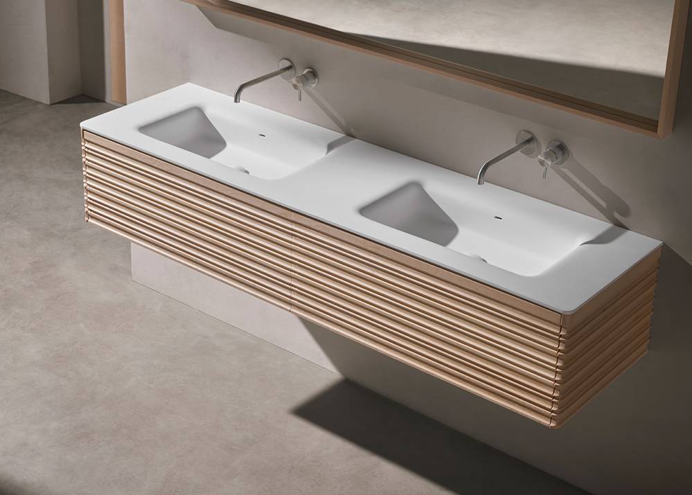 Stecche es una nueva colección de muebles de baño que destaca por su diseño de frentes y costados en madera maciza y su método de producción que lo permite adaptarse a cualquier disposición.
