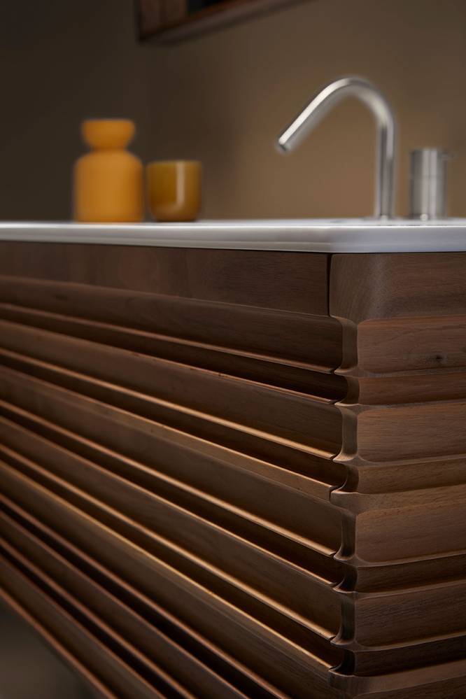 Piezas exclusivas que consiguen un perfecto balance entre la solidez de la cerámica y la sinuosidad de la madera, con gran protagonismo en forma de líneas verticales que aportan dinamismo al mueble.