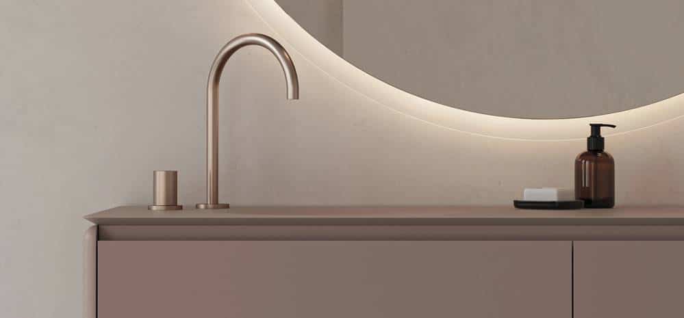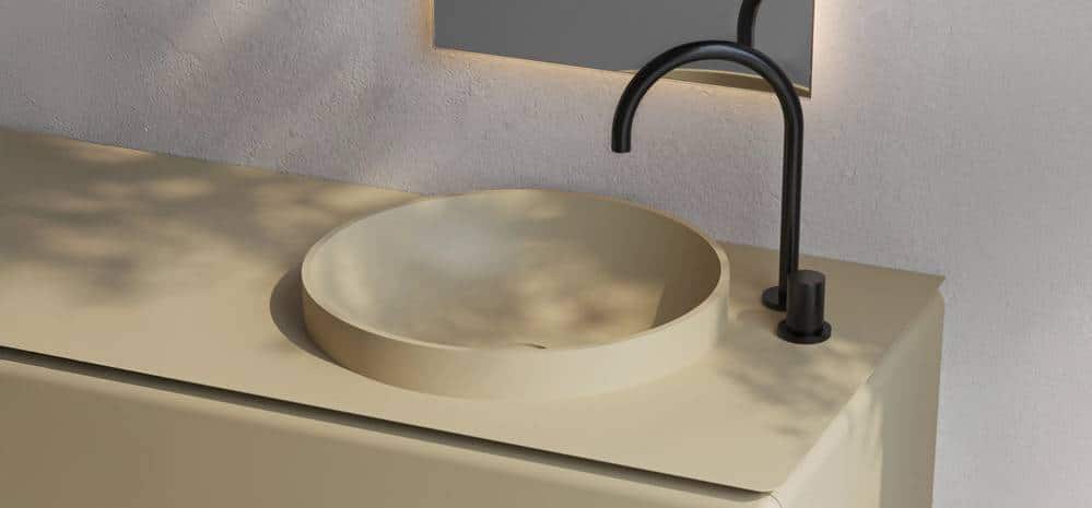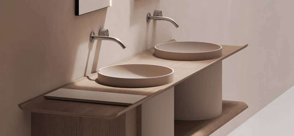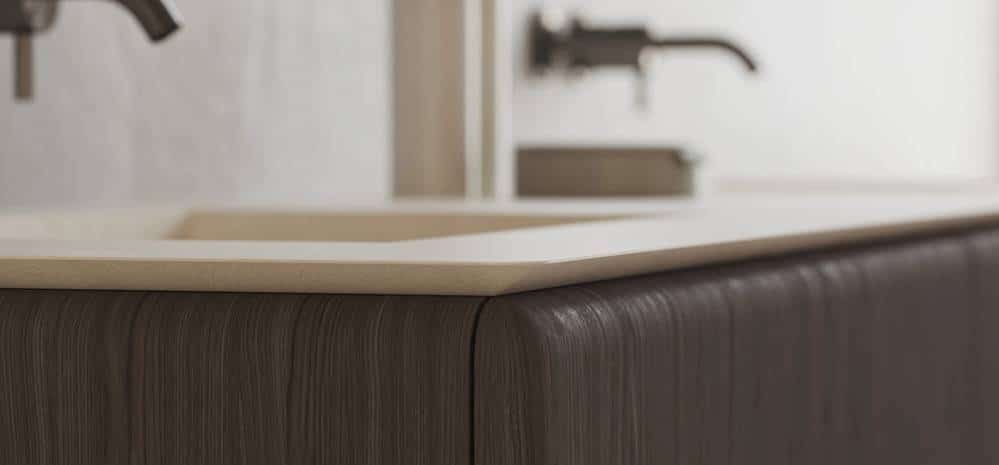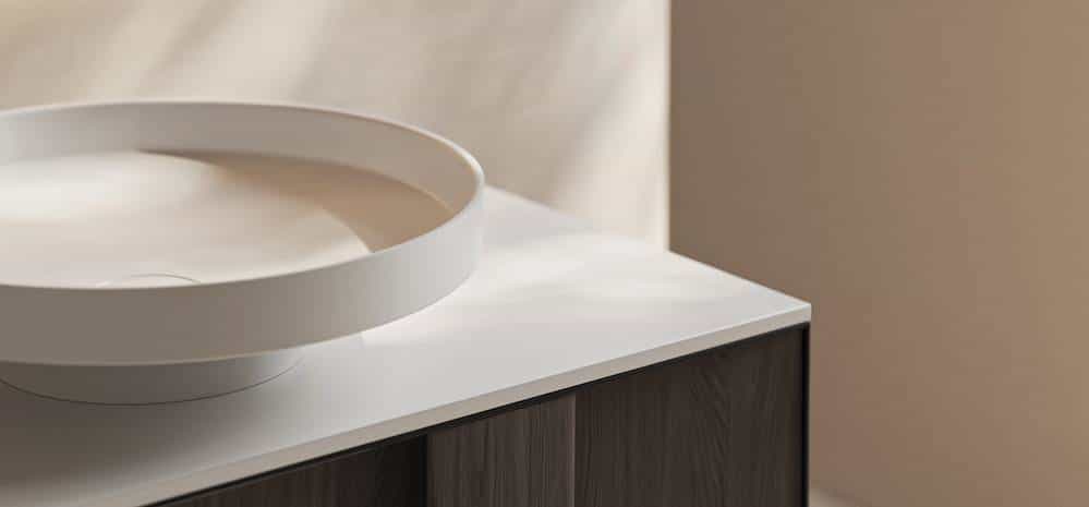 Nueva línea de mobiliario para baño con frentes curvos y laterales redondeados que resuelven el volumen de forma continua, evitando aristas y reforzando la lectura unificada del conjunto.
