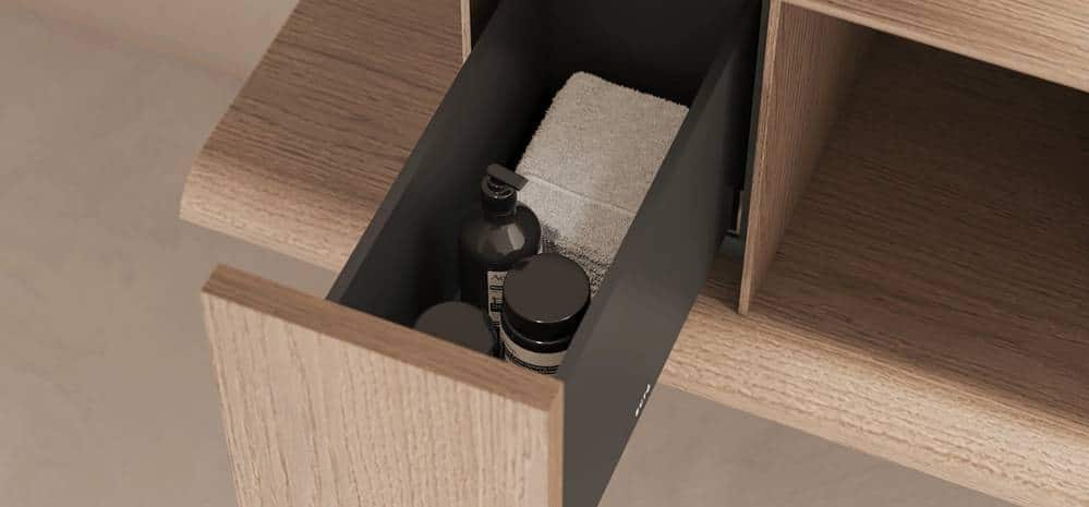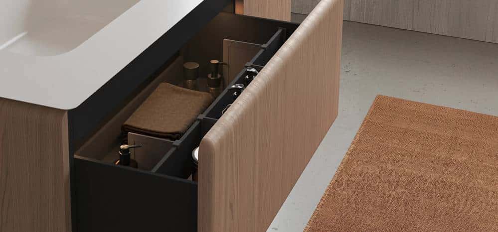 Colección de mobiliario para baño caracterizada por su sistema suspendido de cajones con estructura en madera S3 509 Shadow Wild Oak y frente ranurado vertical.