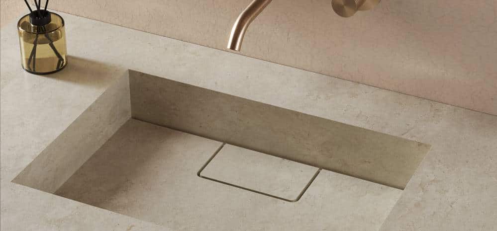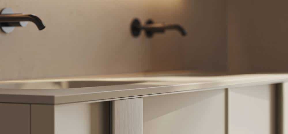 La transición continua entre encimera y lavabo elimina juntas vistas, genera piezas compactas facilitando la limpieza y reforzando la pureza visual