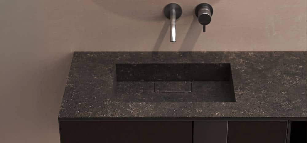 La opción de revestimiento total encapsula el mueble en piedra sinterizada, aportando durabilidad, resistencia y un acabado natural.