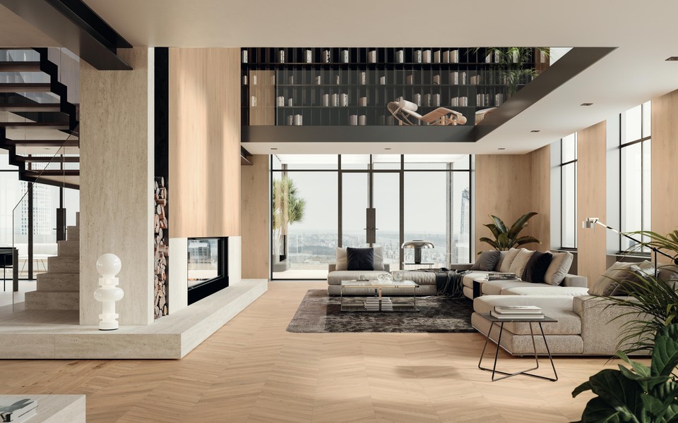 Para interiores, incluye relieves lineales 3D y grandes placas que aportan continuidad visual.