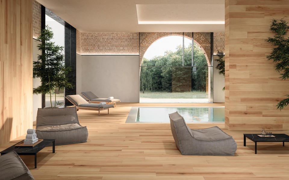Log Cansei traduce la madera de haya del bosque de Cansiglio a cerámica, ofreciendo una colección limitada a 5 tonos naturales y 2 formatos 20×120 y 18,5×150 cm.