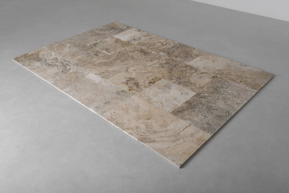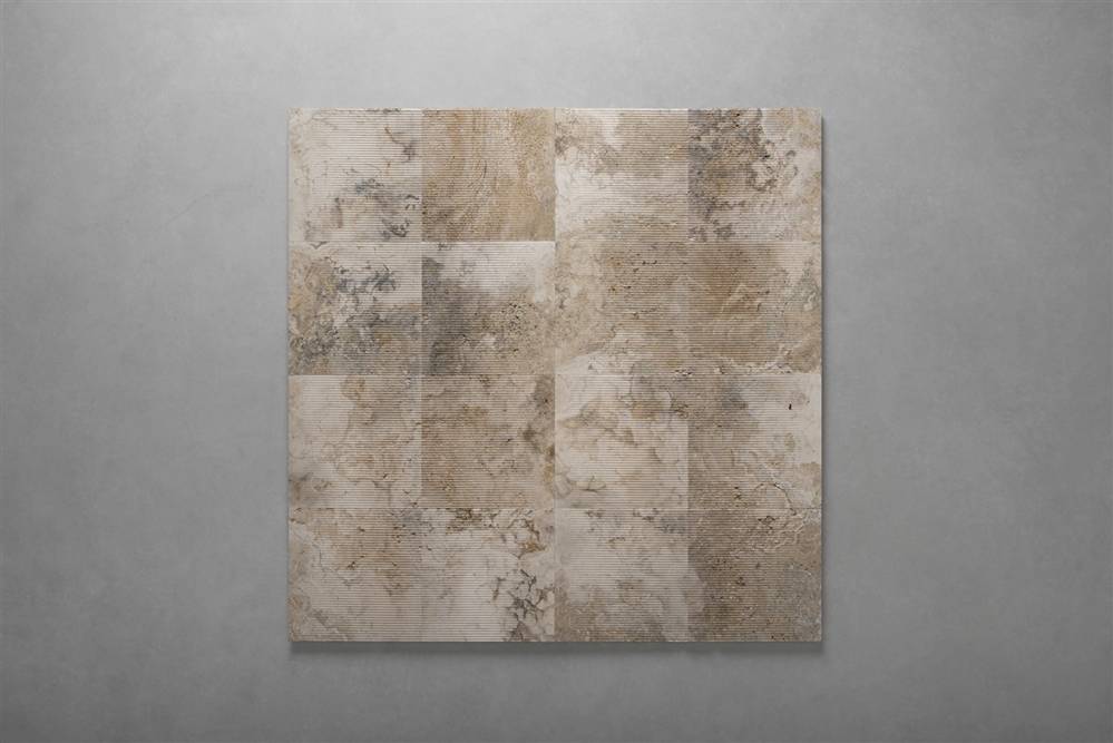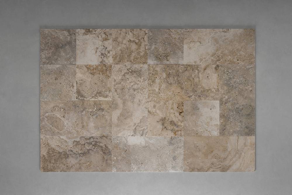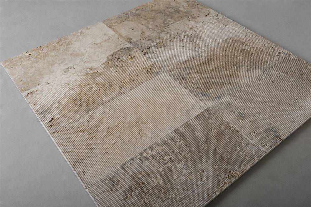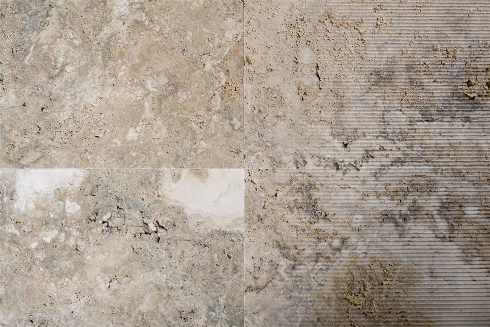 Este sistema modular de piedra natural permite proyectar superficies dinámicas mediante cuatro tipologías combinables: lisa, acanalada, de transición y cuadriculada.