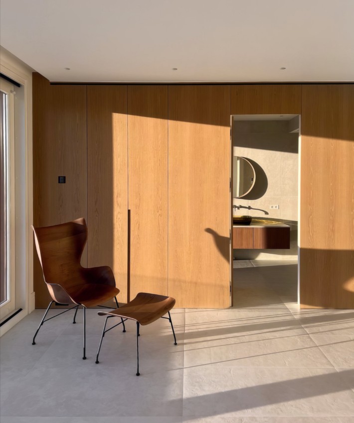 En los baños, este material se combinó con revestimientos decorativos y una cuidada selección de equipamientos, siempre desde una lectura sobria y atemporal, sin estridencias.
